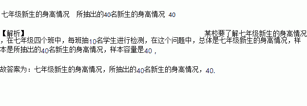 某校要了解七年级新生的身高情况,在七年级四个班中,每班抽10名学生进行检测,在这个问题中,总体是________________________,样本是______________________________,样本容量是________.
