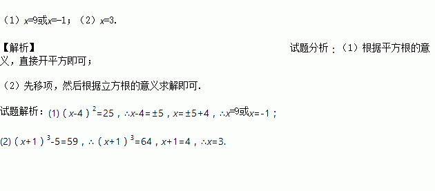 (1)(x-4)2=25; (2)(x+1)3-5=59.