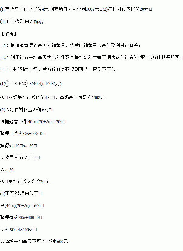 (3)要使商场平均每天盈利1600元,可能吗?请说明理由.