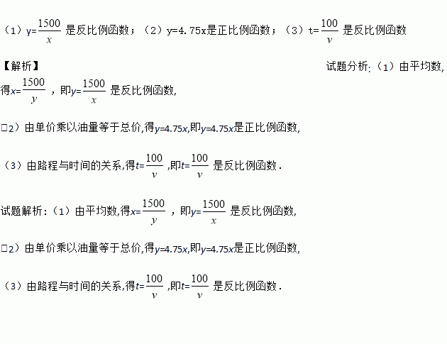 (1)y=是反比例函数;(2)y=4.75x是正比例函数;(3)t=是反比例函数 【解析】试题分析: (1)由平均数,得x=,即y=是反比例函数, (2)由单价乘以油量等于总价,得y=4.75x,即y=4.75x是正比例函数, (3)由路程与时间的关系,得t=,即t=是反比例函数. 试题解析:(1)由平均数,得x=,即y=是反比例函数, (2)由单价乘以油量等于总价,...