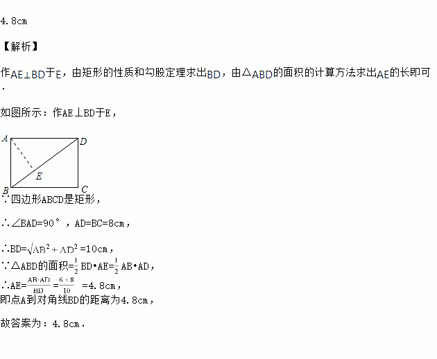 在矩形ABCD中,AB=6cm,BC=8cm,则点A到对角线BD的距离为_____.