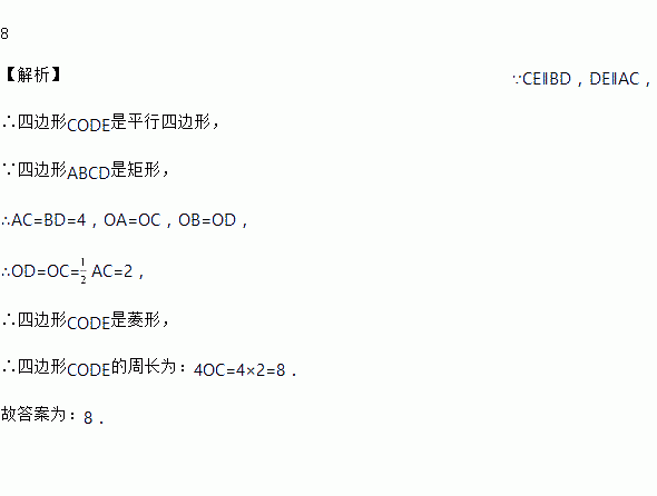 如图,矩形ABCD的对角线AC,BD相交于点O,CE∥BD,DE∥AC.若AC=4,则四边形CODE的周长是_______