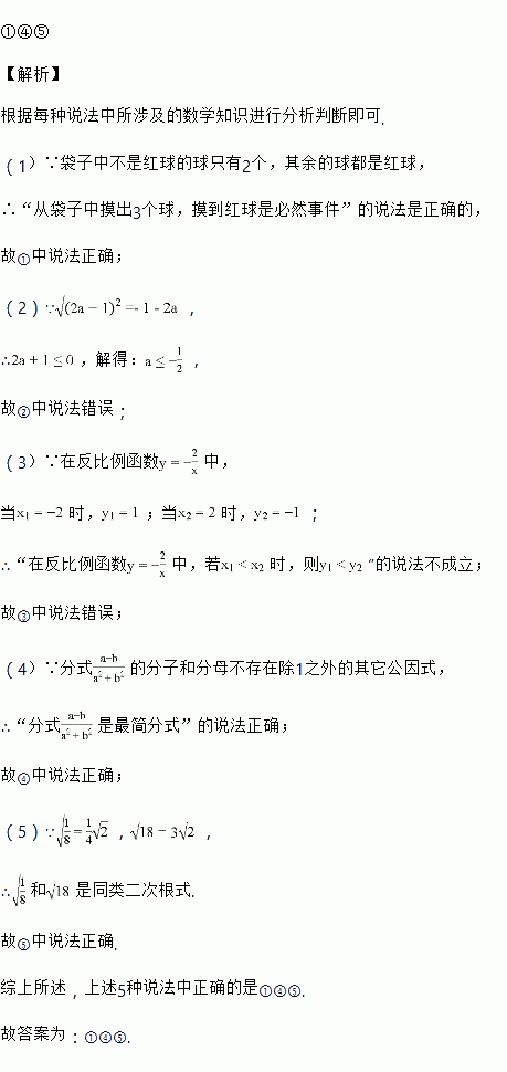 ①在一个装有2白球和3个红球的袋中摸3个球,摸到红球是必然事件.②若