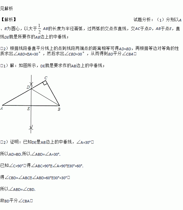(1)用尺规作图作AB边上中垂线DE,交AC于点D,交AB于点E。(保留作图痕迹,不要求写作法和证明);