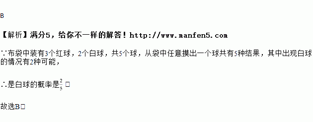在不透明的盒子中装有3个红球,2个白球,它们除颜色外均相同,则从盒中子任意摸出一个球是白球的概率是( )