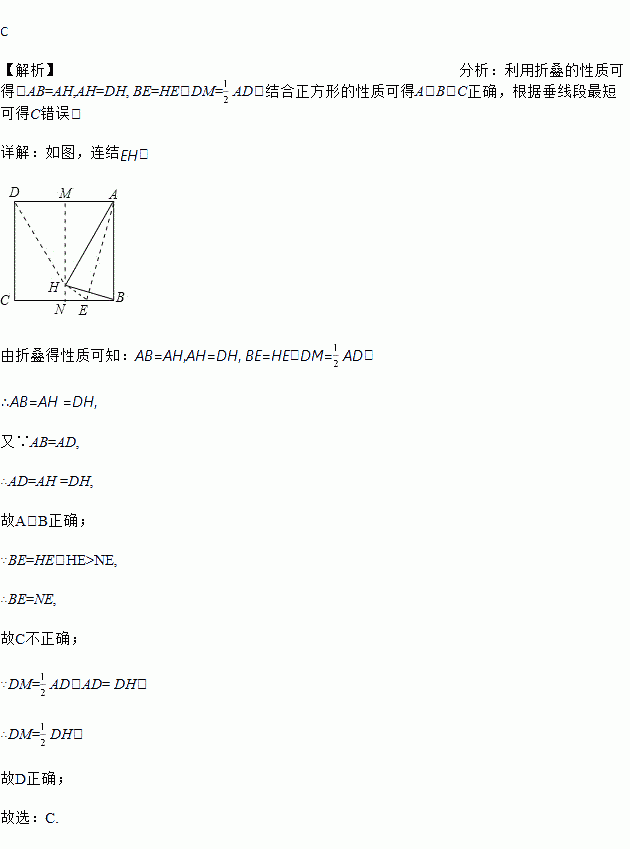 如图,先将正方形纸片儿对折,折痕为MN,再把点B折叠在折痕MN上,折痕为AE,点E在CB上,点B在MN上的对应点为H,沿AH和DH剪下得到三角形ADH,则下列选项错误的是( )
