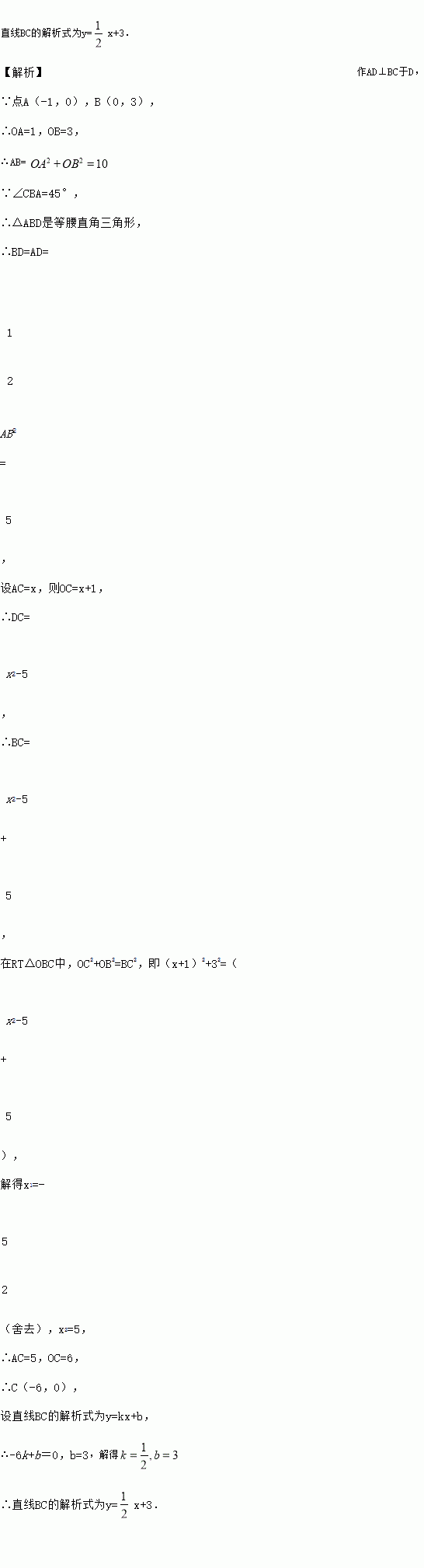 如图,在平面直角坐标系中,点A(-1,0),B(0,3),直线BC交坐标轴于B,C两点,且∠CBA=45° 求直线BC的解析式.