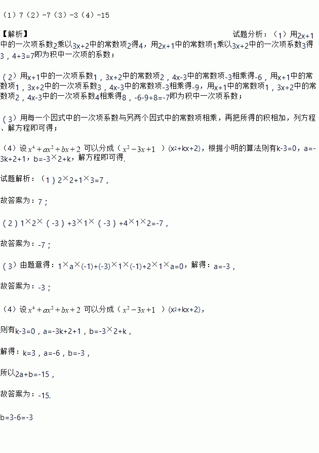的常数项3,相乘得到18.最后将12,16,18相加,得到的一次项系数为46.