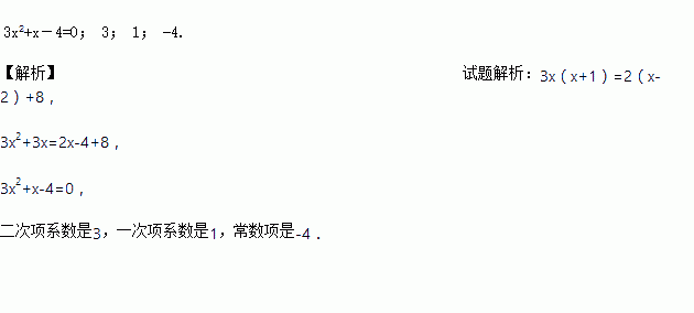 把方程3x(x+1)=2(x–2)+8化为一般形式______,二次项系数______,一次项系数__________,常数项______。