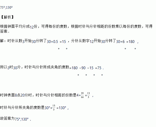 时钟表面3时30分时,时针与分针的夹角的度数是____;8时20分时,时针和分针的夹角的度数是____.