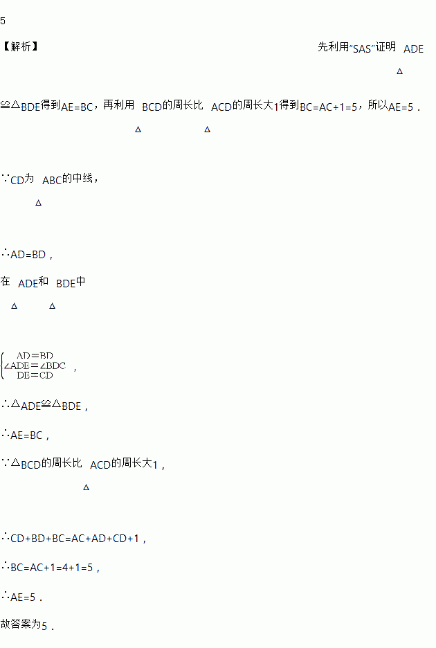 如图,把 △ABC 的中线 CD 延长到 E,使 DE=CD,连接 AE,若 AC=4 且 △BCD 的周长比 △ACD 的周长大1 ,则 AE= ________________.