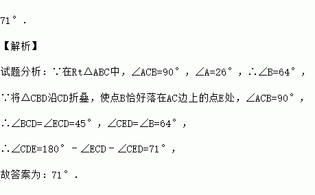 如图,在Rt△ABC中,∠ACB=90°,点D在AB边上,将△CBD沿CD折叠,使点B恰好落在AC边上的点E处.若∠A=26°,则∠CDE= .