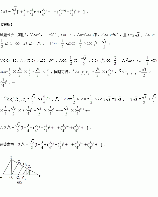 图2也是一种无限分割:在△ABC中,∠C=90°,∠B=30°,过点C作CC1⊥AB于点C1,再过点C1作C1C2⊥BC于点C2,又过点C2作C2C3⊥AB于点C3,如此无限继续下去,则可将利△ABC分割成△ACC1、△CC1C2、△C1C2C3、△C2C3C4、…、△Cn﹣2Cn﹣1Cn、….假设AC=2,这些三角形的面积和可以得到一个等式是 .