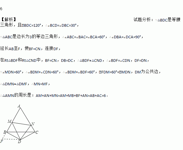 如图,△ABC是边长为3的等边三角形,△BDC是等腰三角形,且∠BDC=120°.以D为顶点作一个60°角,使其两边分别交AB于点M,交AC于点N,连接MN,则△AMN的周长为_____.