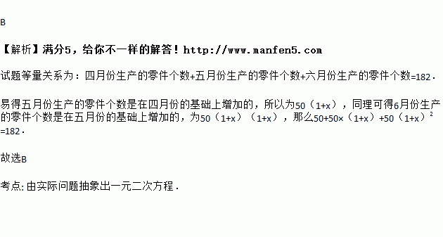 某农机厂四月份生产零件 50 万个,第二季度共生产零件 182 万个.设该厂五、六月份平均每月的增长率为 x,那么 x 满足的方程是( )