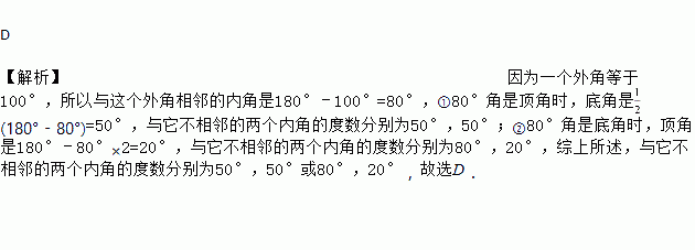 等腰三角形的一个外角等于100°,则与它不相邻的两个内角的度数分别为( )