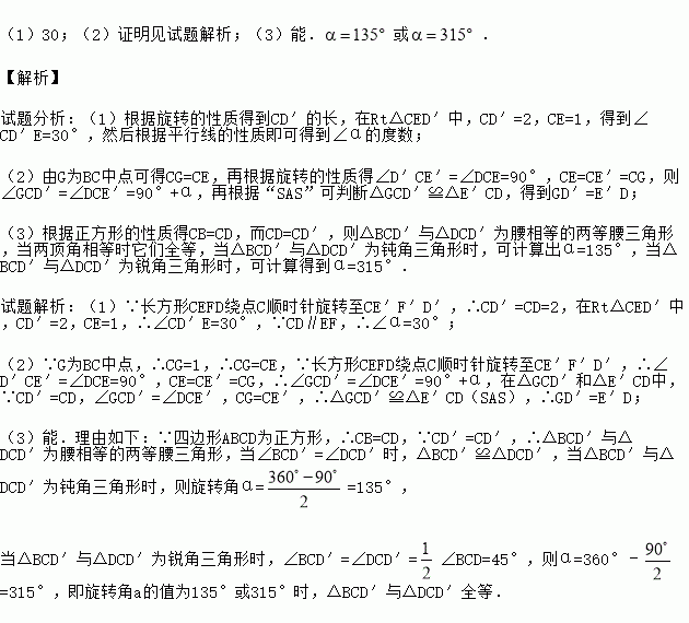 (1)30;(2)证明见试题解析;(3)能.或. 【解析】 试题分析:(1)根据旋转的性质得到CD′的长,在Rt△CED′中,CD′=2,CE=1,得到∠CD′E=30°,然后根据平行线的性质即可得到∠α的度数; (2)由G为BC中点可得CG=CE,再根据旋转的性质得∠D′CE′=∠DCE=90°,CE=CE′=CG,则∠GCD′=∠DCE′=90°+α,再根据“SAS”可判断△...