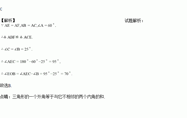 如图,AE=AF,AB=AC,EC与BF交于点O,∠A=60°,∠B=25°,则∠EOB的度数为( )