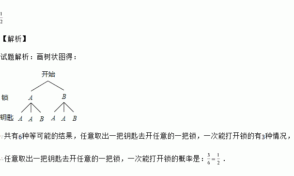 有两把不同的锁和三把钥匙,其中两把钥匙能打开同一把锁,第三把钥匙能打开另一把锁.任意取出一把钥匙去开任意的一把锁,一次能打开锁的概率是 .