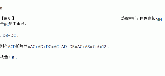 如图,在△ABC中,AB>AC,分别以点B和点C为圆心,大于BC一半的长为半径作圆弧,两弧相交于点M和点N,作直线MN交AB于点D;连结CD,若AB=7,AC=5,则△ACD的周长为( )