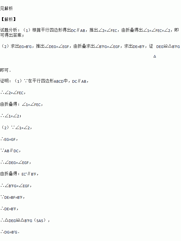 如图,在?ABCD中,点E,F分别在边DC,AB上,DE=BF,把平行四边形沿直线EF折叠,使得点B,C分别落在B′,C′处,线段EC′与线段AF交于点G,连接DG,B′G.