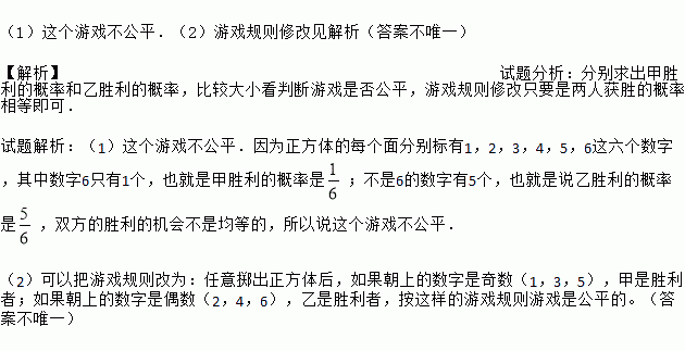 有一个小正方体,正方体的每个面分别标有1,2,3,4,5,6这六个数字.现在有甲、乙两位同学做游戏,游戏规则是:任意掷出正方体后,如果朝上的数字是6,甲是胜利者;如果朝上的数字不是6,乙是胜利者.你认为这个游戏规则对甲、乙双方公平吗?为什么?如果不公平,你打算怎样修改才能使游戏规则对甲、乙双方公平?