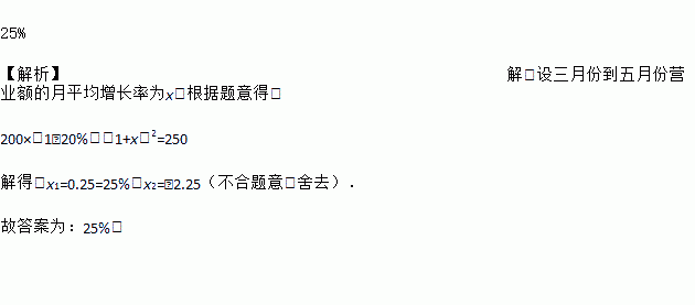 某商场今年二月份的营业额为200万元,三月份由于经营不善,其营业额比二月份下降20%,后来通过加强管理,五月份的营业额达到250万元.则三月份到五月份营业额的月平均增长率为_____.