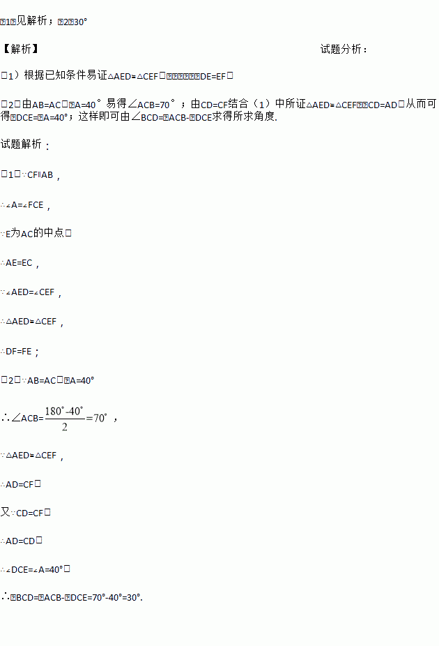 如图,在△ABC中,AB=AC,,点D是边AB上一点,E为AC的中点,过点C作CF∥AB, 交DE的延长线于点F。