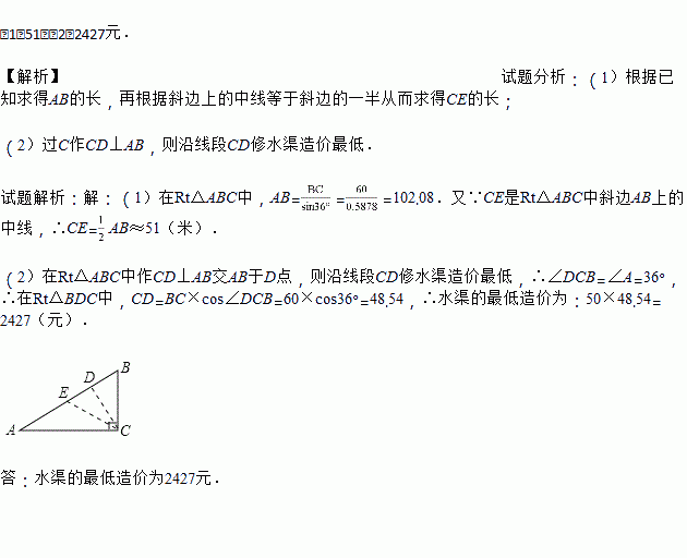 (2)若D点在AB边上,计划沿线段CD修一条水渠.已知水渠的造价为50元/米,水渠路线应如何设计才能使造价最低,求出最低造价.
