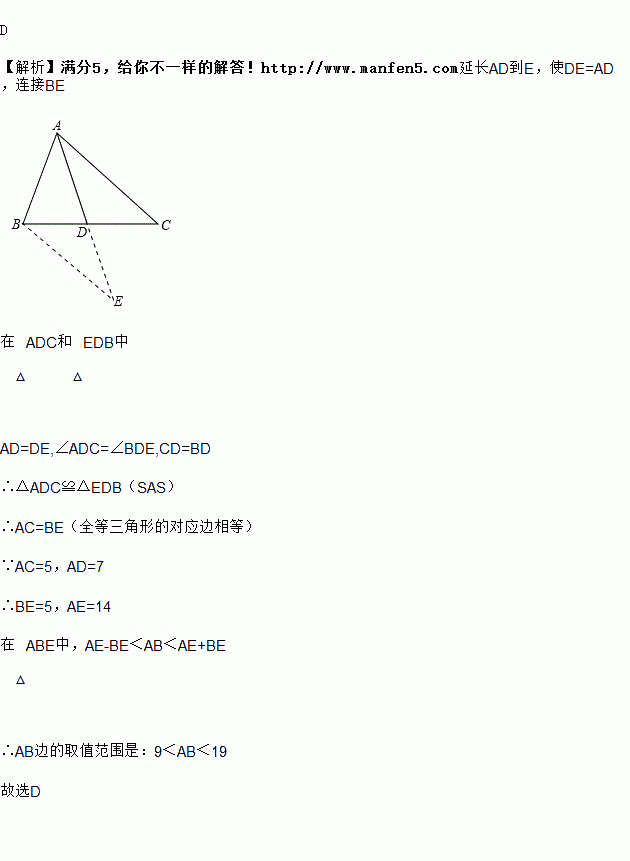 △ABC中,AC=5,中线AD=7,则AB边的取值范围是( )