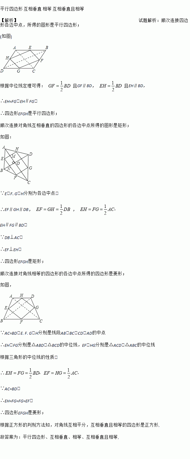 顺次连接四边形各边中点,所得的图形是__________。顺次连接对角线______________的四边形的各边中点所得的图形是矩形。顺次连接对角线_________的四边形的各边中点所得的四边形是菱形。顺次连接对角线_________的四边形的各边中点所得的四边形是正方形。