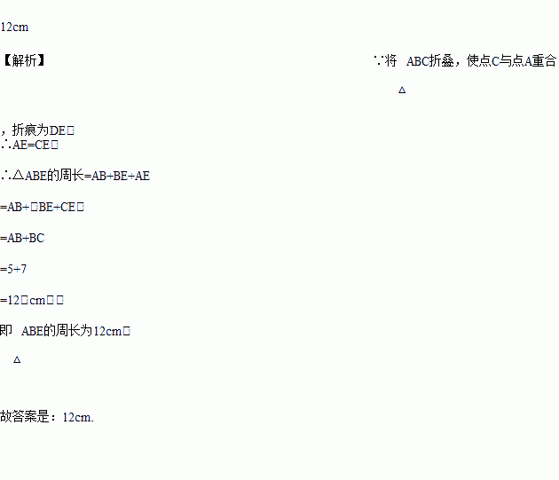 如图所示,在△ABC中,AB = 5,BC = 7,将△ABC折叠,使点C与点A重合,折痕为DE,则△ABE的周长为________