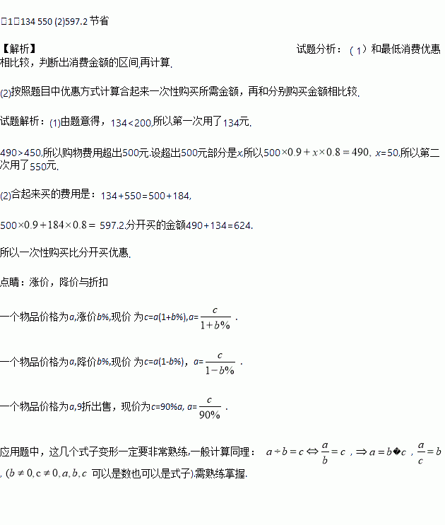 (2)若小欣妈妈将两次购买的物品一次全部买清,则她是更节省还是更浪费?说说你的理由.