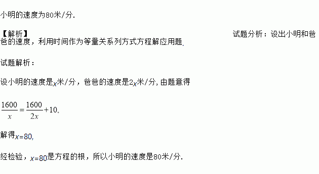 小明的家离学校1600米,一天小明从家出发去上学,出发10分钟后,爸爸发现他的数学课本忘记拿了,立即带上课本去追他,正好在校门口追上他,已知爸爸的速度是小明速度的2倍,求小明的速度.
