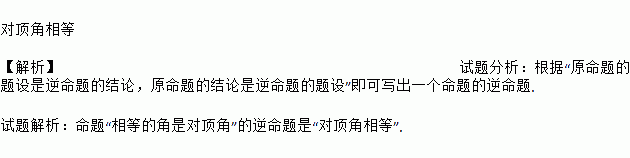 对顶角相等 【解析】试题分析:根据“原命题的题设是逆命题的结论,原命题的结论是逆命题的题设”即可写出一个命题的逆命题. 试题解析:命题“相等的角是对顶角”的逆命题是“对顶角相等”.