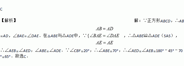 如图,在正方形ABCD中,点F为CD上一点,BF与AC交于点E,若∠CBF=20°,则∠AED等于( )