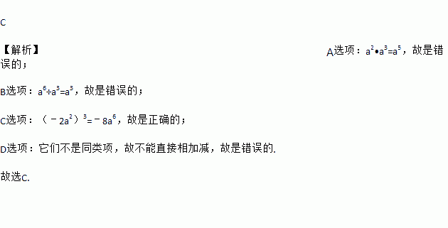 A. a2•a3=a6 B. a6÷a3=a2 C. (﹣2a2)3=﹣8a6 D. 4x3﹣3x2=1