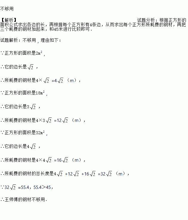 王师傅有一根长45米的钢材,他想将它锯断后焊成三个面积分别为2平方米、18平方米、32平方米的正方形铁框,问王师傅的钢材够用吗?请通过计算说明理由.