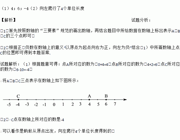 (1)4;6;-4(2)向左爬行了4个单位长度 【解析】试题分析: (1)首先按照数轴的“三要素”规范的画出数轴,再结合题目中所给数据在数轴上标出表示A、B、C的三个点即可. (2)根据正、负数在数轴上的意义“以原点为起点向右为正,向左为负”结合(1)中所画数轴上点C的位置即可得到本题答案. 试题解析:(1)根据题意可得:点A所对应的数为:0+4=4,点B所对应的数为:4+...