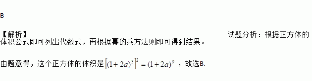 B 【解析】试题分析:根据正方体的体积公式即可列出代数式,再根据幂的乘方法则即可得到结果。 由题意得,这个正方体的体积是,故选B.