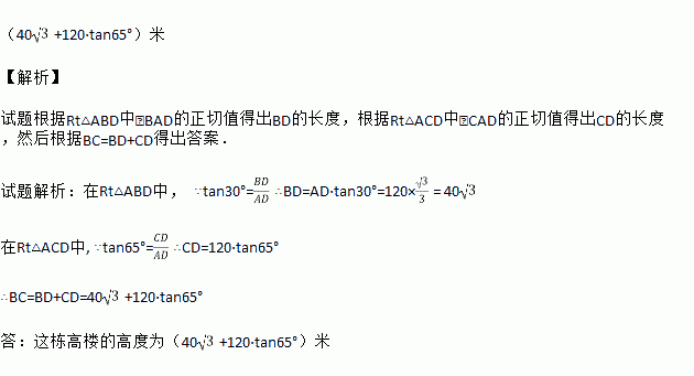 (6分)如图,热气球的探测器显示,从热气球A处看一栋高楼顶部B的仰角为30°,看这栋高楼底部C的俯角为65°,热气球与高楼的水平距离AD为120m.求这栋高楼的高度.(结果用含非特殊角的三角函数及根式表示即可)