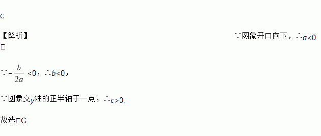 C 【解析】∵图象开口向下,∴a<0, ∵?<0,∴b<0, ∵图象交y轴的正半轴于一点,∴c>0. 故选:C.