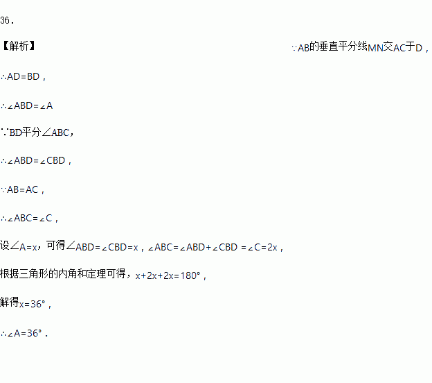 如图,在△ABC中,AB=AC,AB的垂直平分线MN交AC于D点.若BD平分∠ABC,则∠A=________°.