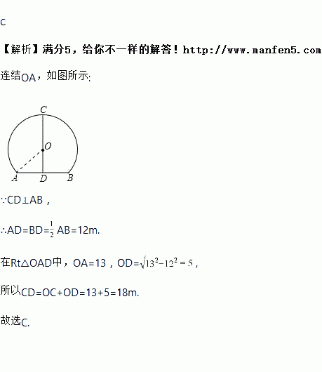 据史料记载,雎水太平桥建于清嘉庆年间,已有200余年历史。桥身为一巨型单孔圆弧,既没有用钢筋,也没有用水泥,全部由石块砌成,犹如一道彩虹横卧河面上,桥拱半径OC为13m,河面宽AB为24m,则桥高CD为( )