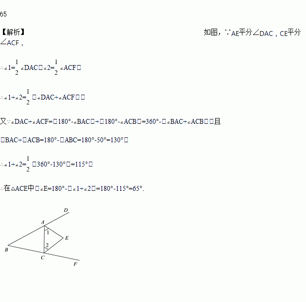 如图,在△ABC中,∠B=50°,三角形的外角∠DAC和∠ACF的平分线交于点E,则∠AEC=_______°.