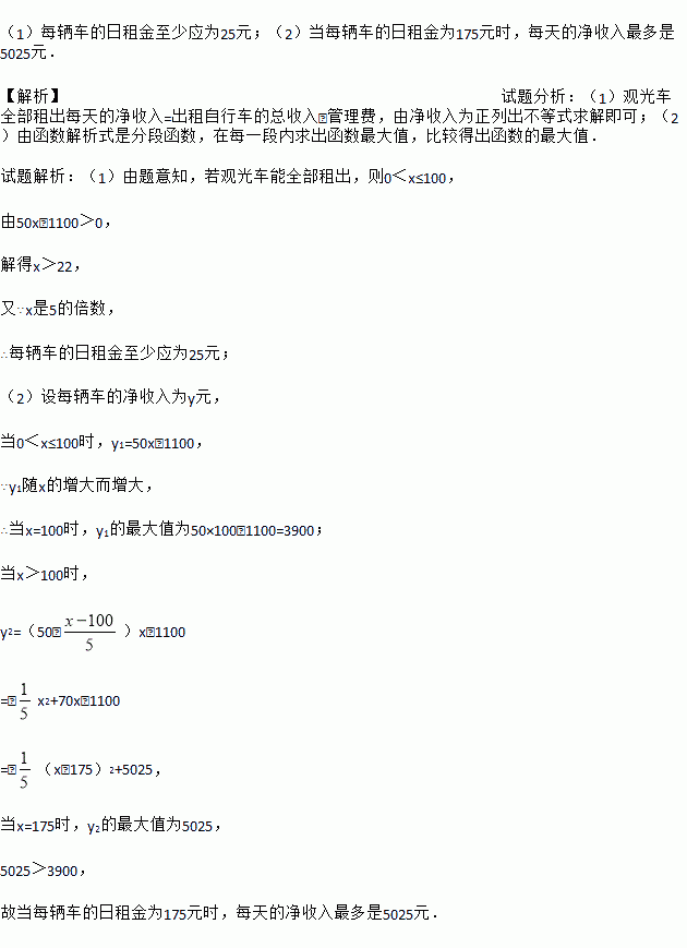 旅游公司在景区内配置了50辆观光车共游客租赁使用,假定每辆观光车一天内最多只能出租一次,且每辆车的日租金x(元)是5的倍数.发现每天的营运规律如下:当x不超过100元时,观光车能全部租出;当x超过100元时,每辆车的日租金每增加5元,租出去的观光车就会减少1辆.已知所有观光车每天的管理费是1100元.