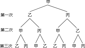 19.A,B,C三位同学进行排球传球练习,球由一个人随机传给另一个人,且每位传球人传球给其余两人的机会是均等的,由A开始传球,共传三次(毎传一个人为一次).(1)请用树状图表示出传球三次的所有等可能情况;