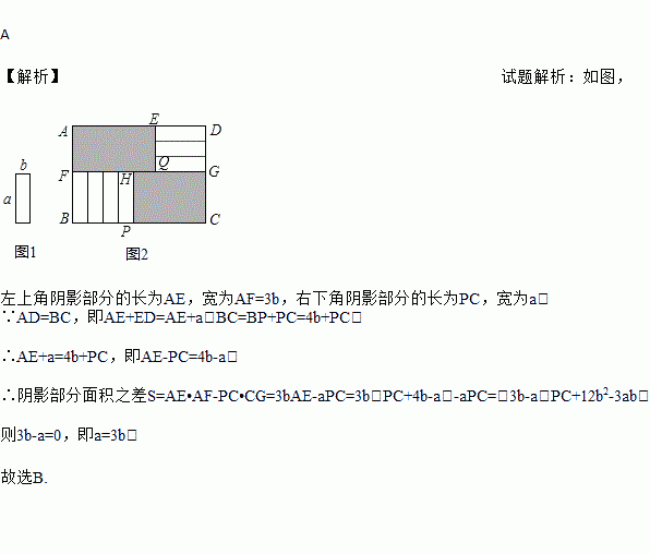 A 【解析】试题解析:如图, 左上角阴影部分的长为AE,宽为AF=3b,右下角阴影部分的长为PC,宽为a, ∵AD=BC,即AE+ED=AE+a,BC=BP+PC=4b+PC, ∴AE+a=4b+PC,即AE-PC=4b-a, ∴阴影部分面积之差S=AE•AF-PC•CG=3bAE-aPC=3b(PC+4b-a)-aPC=(3b-a)PC+12b2-3ab, 则3b-a=0,即...