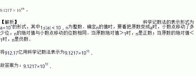 2015年阿里巴巴双11全天交易额突破912.17亿元,请用科学记数学表示912.17亿元=_____元.