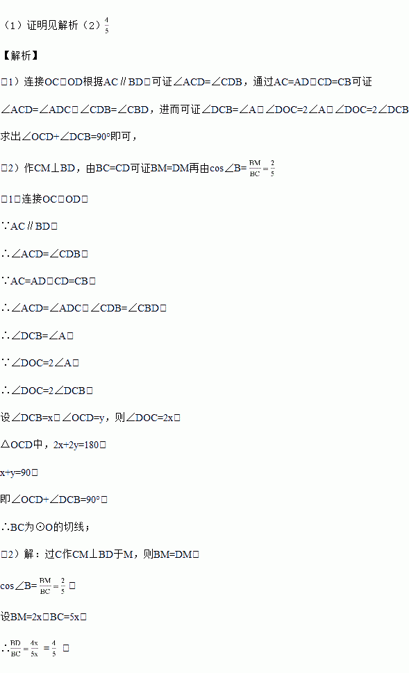 如图,⊙O过A,C,D三点,过D作DB∥AC,且AC=AD,CD=CB.